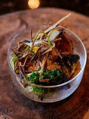 A alimentação é plant based, servida no restaurante no formato buffet.